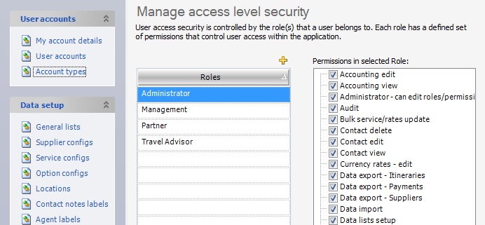 To add additional User roles click on Account types (shown above) to view the available Permission options. You will need to look at and review the Permissions for Management and Travel Advisor roles and select appropriate permissions.