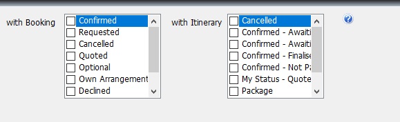 Note: The with Booking and with Itinerary fields lists all the statuses loaded in Tools > Setup > General lists > Itinerary status and Tools > Setup > General lists > Request status