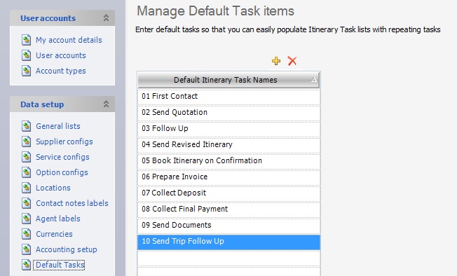 Default Tasks populate the Name field in the Tasks workspace on the Itinerary Tab (as seen in the image below). These act as a working checklist for each Itinerary.