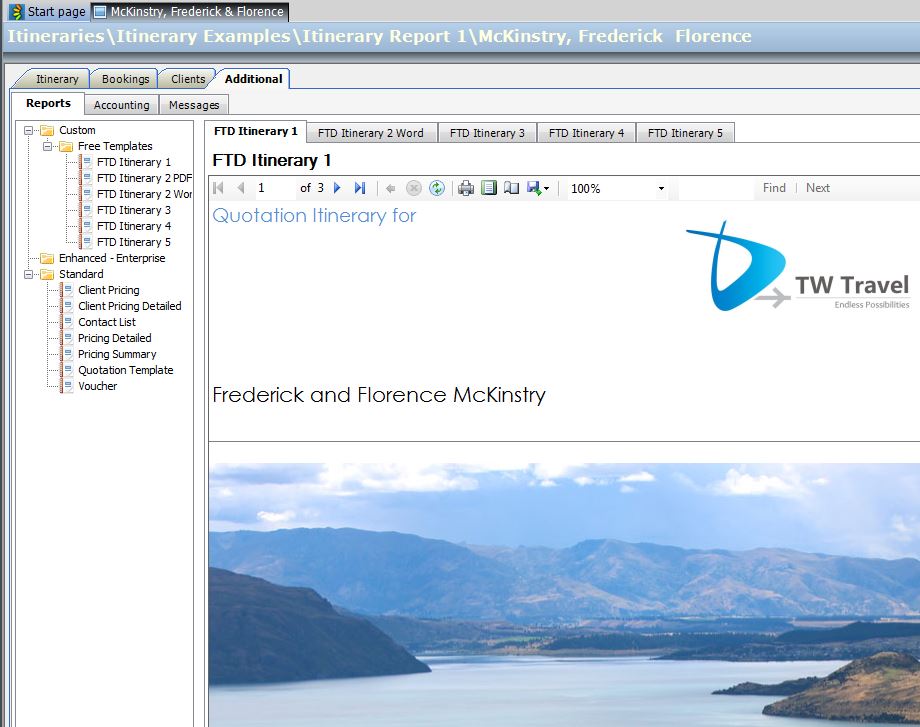 Travelmesh provides all Users with five Itinerary Templates, which are found in any Itinerary by clicking on the Additional Tab and then on the Reports Subtab (as seen below). To download an example of any of the Free Templates please click on any of the links provided below. Images of the front page of each of these reports are also included (scroll down to view)