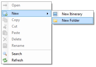 To create new top-level folders (to sit below the main Itineraries yellow folder), right click anywhere within the Itineraries menu and select New > New Folder. The folder that is created will be called New Folder, simply right click the New Folder and select Rename.