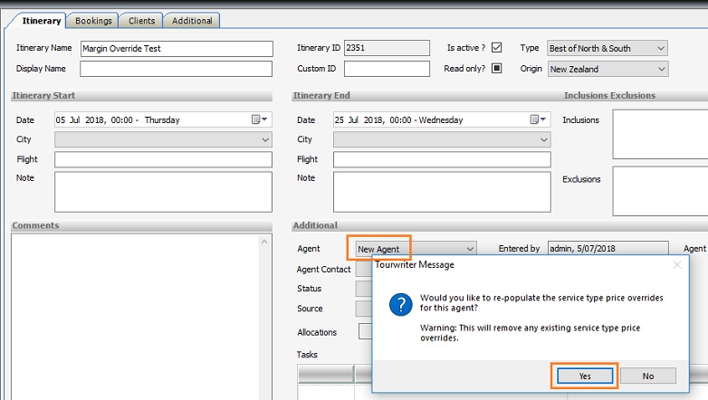 1. For an existing itinerary, choosing the newly added Agent or switching to a different Agent pulls through the Agent overrides from the Agent Label area.