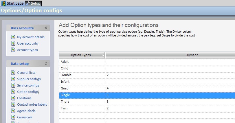 The Divisor field is used to specify how the cost of an option will be divided in order to get a per person price. You will see in the image above that the Adult, Child and Infant Divisor fields are empty due to the fact that the per person cost always remains the same.