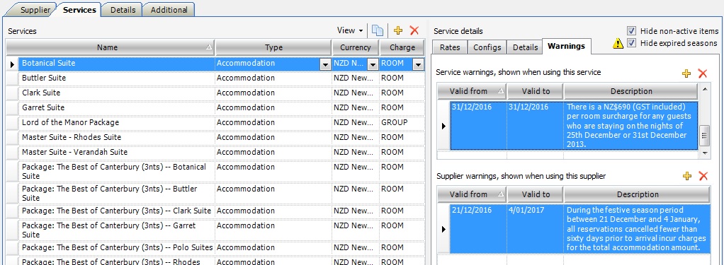 This is where specific Service and/or Supplier information can be entered as Warnings across a certain date range. The purpose of loading warnings is to alert the user that the Service or Supplier may not be an appropriate option. Applicable warning messages (once loaded)  will pop up when the Service or Supplier is dragged and dropped into an itinerary.