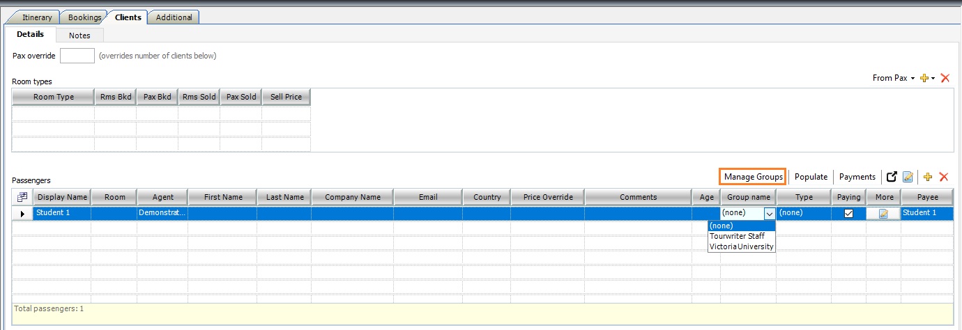 You can also add groups through the Passengers grid in the Clients tab of the itinerary. Clicking Manage Groups in the Passengers grid opens the Define Groups window. Once you add groups, you can choose whether they are paying travellers by selecting the Paying checkbox. You can further select the payee and the group they belong to in the Group name and the Payee drop-down.