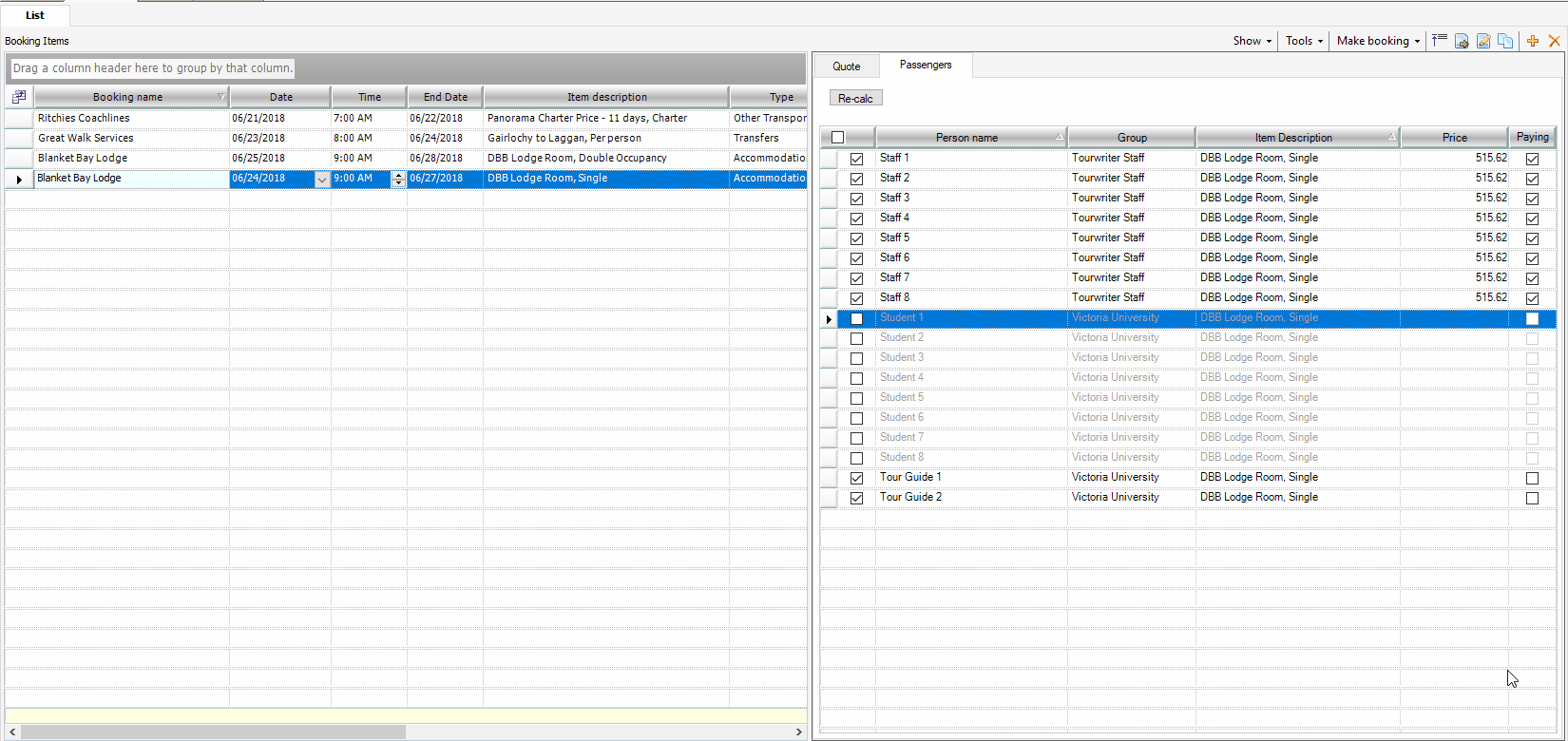 Note: As we see in the screenshot above, the Include and the Paying checkboxes against the DBB Lodge Double rooms are not ticked for the Staff members. That is because they have opted for Single rooms. The other group, University Students, has the Include checkbox ticked for the Double room. Even though the Tour Guide will be lodging, they will not pay for the room, and hence they do not have the Paying Checkbox ticked. The members of the group will share the cost of their respective Tour Guide.