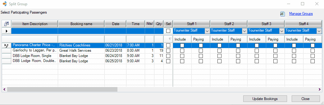 1. After linking booking items to each member and choosing whether they are paying travellers, click Update Bookings. This selection maps the correct booking charge to each group. Each group appears as a column in the booking tab of the itinerary.