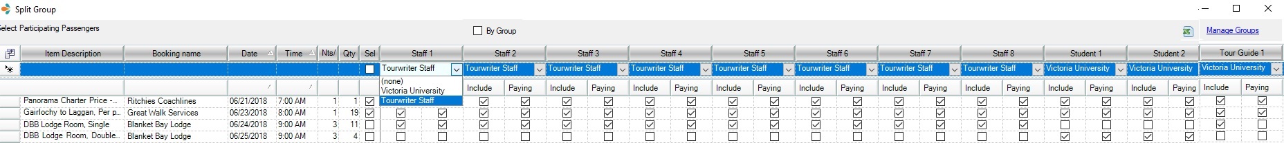 Note: In the example above, we have sorted the view By Group to display the two groups, i.e. Travelmesh Staff and Victoria University. Thus, by sorting the view by group rather than by passenger, you can configure split group pricing per group.