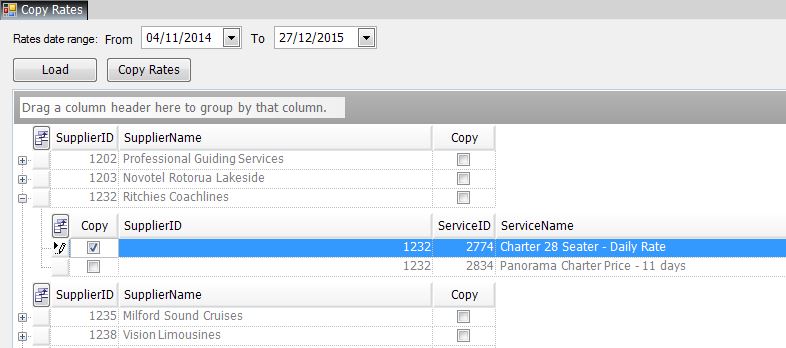 5. Alternatively, to review individual Service and season information before copying, expand the Supplier by clicking the plus sign at the far left of the Supplier and select individual Services/seasons to copy. If upon review, all Services/seasons can be copied, just click (tick) the box in the Copy column at Supplier level.Copy Rate with Selection