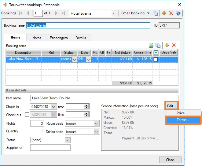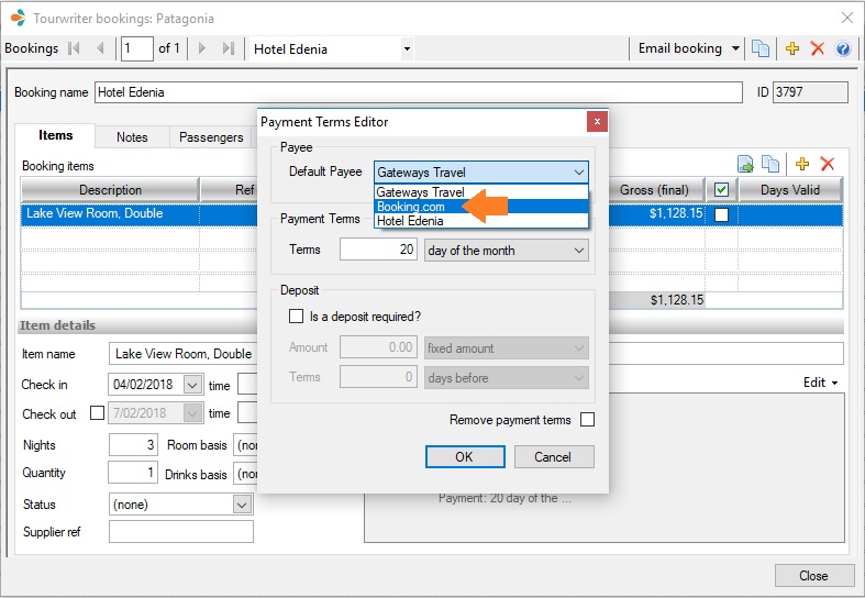 If you would like to change the Payee at the Booking level, double click the booking, and select Edit > Terms…