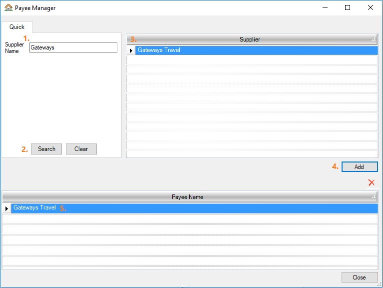 1. On the Payee Manager screen, type in the Supplier Name (or part thereof)