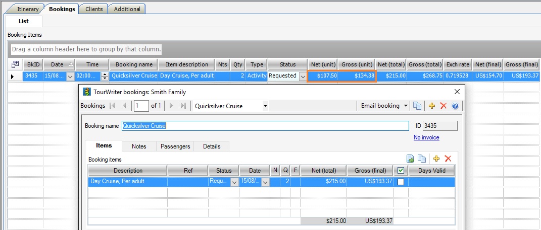 - The Net (unit) and Gross (unit) fields on the Bookings editor and Bookings List will automatically calculate based on the Nts and Qty for that booking.