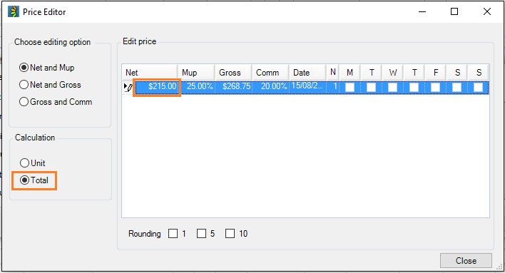NOTE: The Total editing option will not be remembered for next time. If editing the price again, ensure the Total option is selected from the Calculation options before proceeding.