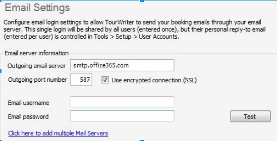 Travelmesh can send booking requests etc. to Suppliers. To enable this, you must enter login details of an email account that Travelmesh will use to send emails. These login details will be used to authenticate the sending of emails for all staff (i.e. one account to authenticate all staff). Each staff member can have their own personal email address, and this will be used in the ‘reply-to’ field, so when an email is replied to, it will go to that user’s email address (received by eg Outlook, not Tourwriter).