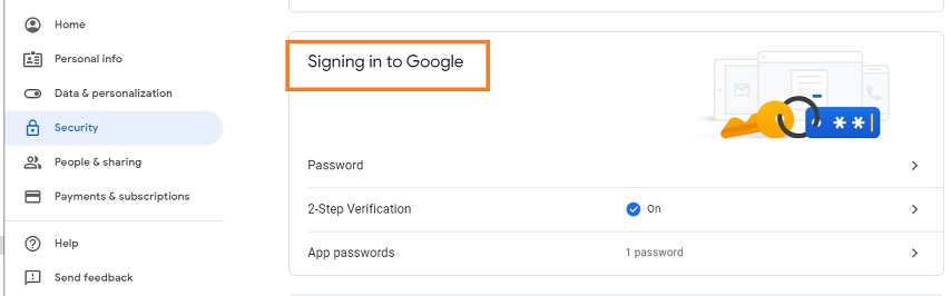 4. Now that you have enabled 2-step verification for your Google Account, go back to Google Accounts and under the Signing in to Google section, select App passwords.