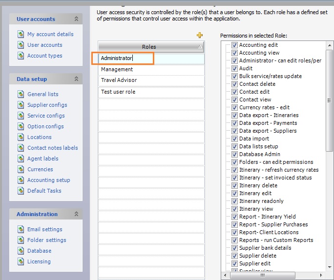 This doc will help you understand how permissions are set up in Tourwriter. The three default roles configured in Travelmesh are Administrator, Management and Travel Advisor. Additional roles can be added to this list. This can be done by performing the following steps: