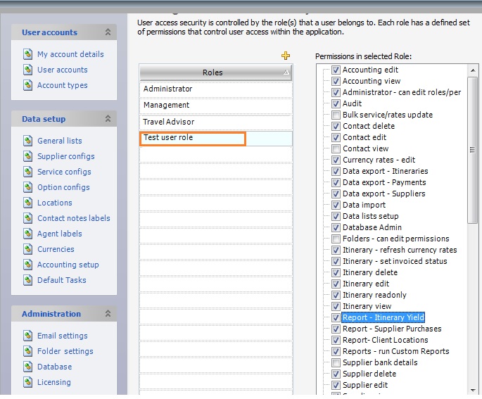 - The existing roles, such as the Travel Advisor role can be restricted to fewer permissions. For example, Travel Advisors may only be given permission to add, delete or edit contacts and itineraries and additionally run reports.