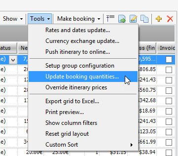 Next, go back to the Bookings List and select Update Booking Quantities from the Tools drop-down menu in the right-top corner.
