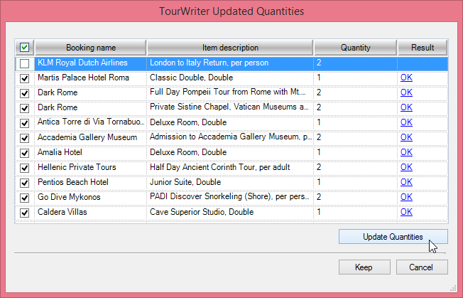 The KLM Royal Dutch Airlines Booking Line has been unticked, as it was added to the Itinerary with the correct quantities, so does not require updating (if left ticked, the number will also be updated e.g. Quantity is currently two, to update for two pax, the Quantity will become four).